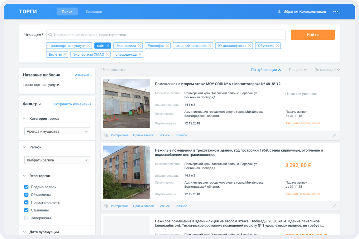 Aggregation system for Russian government auctions. The platform uses an accessible interface to quickly and easily find the necessary trades and get all the necessary information on them in a fast manner.